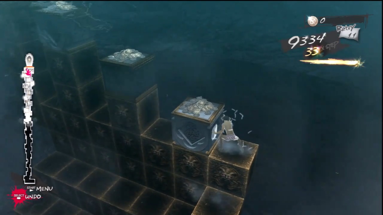 … comienza la chicha del juego. Hablar con gente, enviar sms, beber como un loco…todo eso está muy bien pero este juego además de una interesante historia esconde uno de los mejores juegos de puzle de la presente generación. Nuestro objetivo nocturno consistirá en superar los distintos pisos (a su vez divididas en secciones) de la torre día tras día; para ello deberemos escalar fabricando nuestro propio camino, animados por rápidas melodías que conseguirán ponernos en tensión, a base de mover bloques lo más rápido posible y a poder ser sin obstaculizar nuestro siguiente movimiento; poniendo algunas condiciones como que solo podremos escalar bloques de uno en uno o descolgarnos para poder avanzar alrededor de ellos. Sin embargo no todo iba a ser tan sencillo.